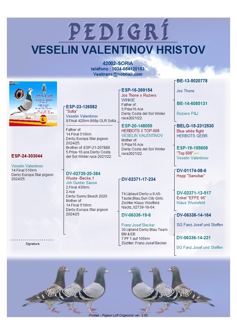 Las palomas hasta el año 2023 inclusive están sexadas por ADN y tienen una fiabilidad del 99%. Consulte antes del envío la posibilidad de añadir un certificado de paternidad por 60€